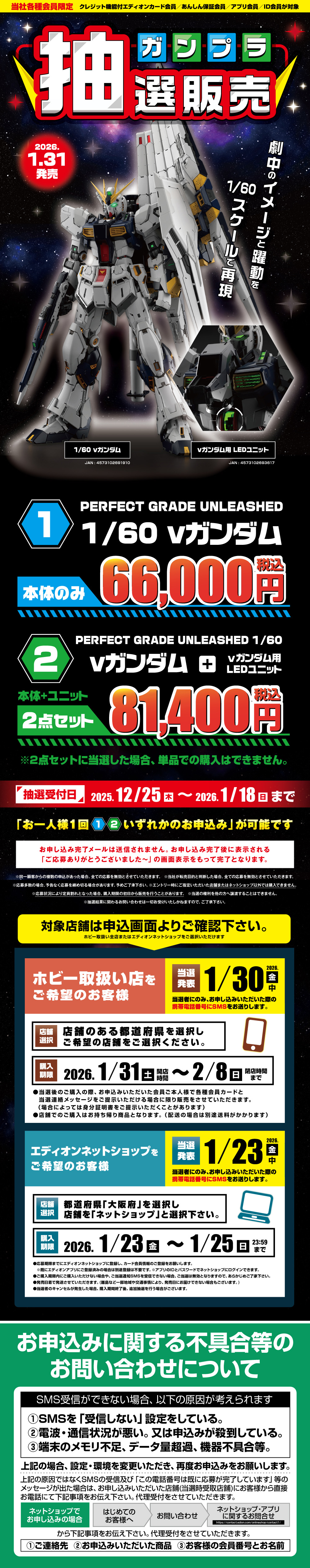 抽選結果は以下の内容で当選者様にのみご連絡させていただきます。 ①店舗での購入をご希望のお客様は2026年1月30日(金)中にお申込み時の携帯電話番号にSMSメッセージにて配信致します。 ②ネットショップでの購入のお客様は2026年1月23日(金)中にお申込み時の携帯電話番号にSMSメッセージにて配信致します。